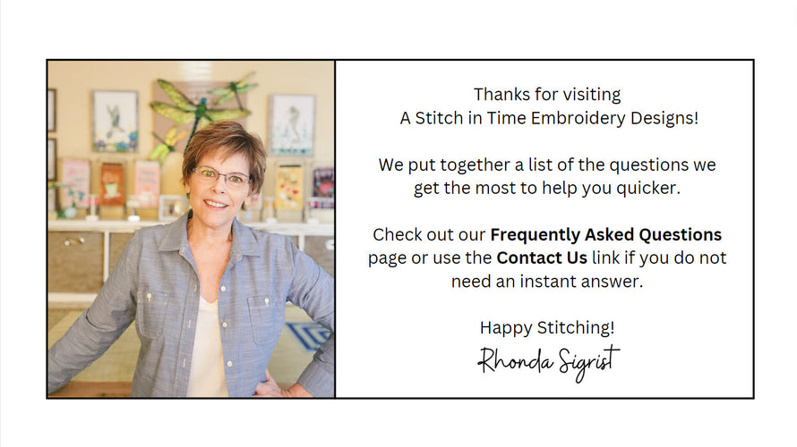 Watch this video of Rhonda & Jonathan, the owners and digitizers at A Stitch in Time Embroidery Designs here: A Chat with Rhonda & Jonathan