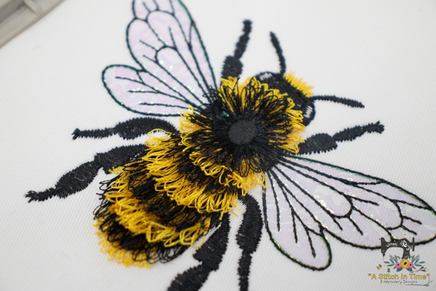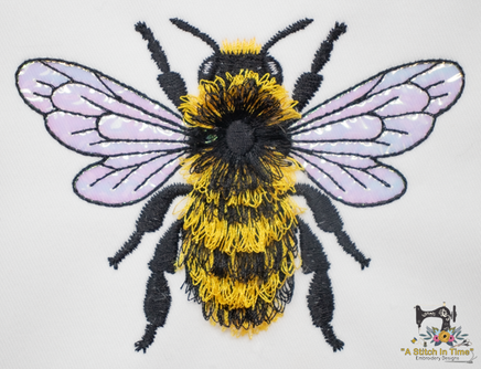 This Bee design is created with fringe type stitching so when finished is a fluffy design. We digitized it for use with iridescent mylar in the wings.