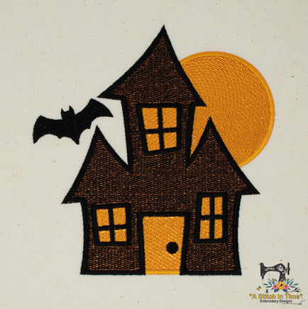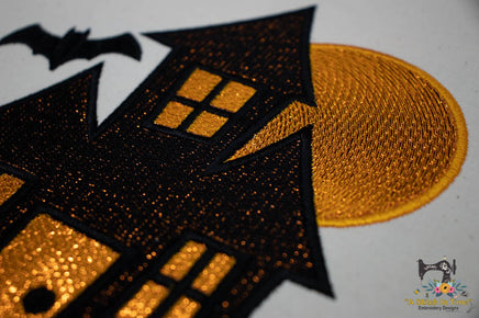 This shimmery haunted house design is digitized with a light fill that "shows through" and stitched out with orange mylar underneath. This creates a sparkly jewel toned effect that is so pretty!