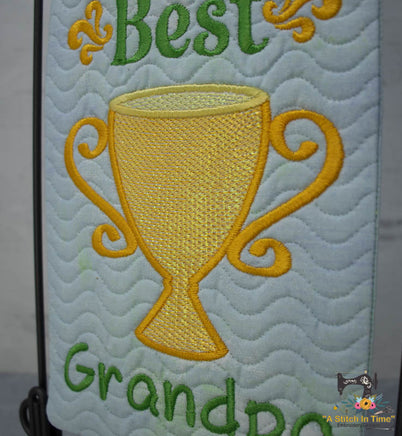 Cute Father's Day themed mini quilt to display in your home. Trophy has mylar over the applique fabric which gives it a nice sparkle.