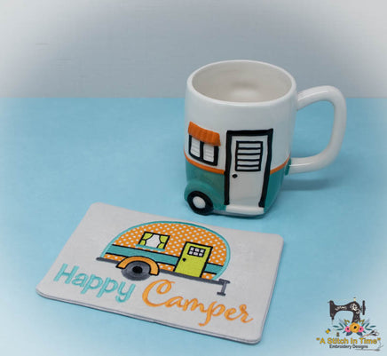 *This listing is for the ITH Happy Camper Mug Rug design file only. Any other designs or supplies shown in photos here are samples of completed projects using additional designs and supplies.