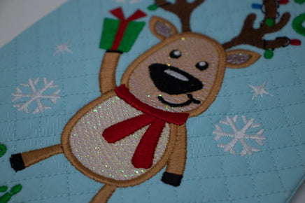 This fun holiday hanging features a light fill for use with Mylar. The Mylar gives the design a nice sparkle. The completed hanging fits in a wire stand. The reindeer is an applique style element with a layer of iridescent mylar over the fabric