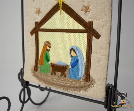 This holiday hanging features a light fill for use with Mylar. The Mylar gives the design a nice sparkle. The completed hanging fits in a wire stand. The manger is an applique style element with a layer of iridescent mylar over the fabric.