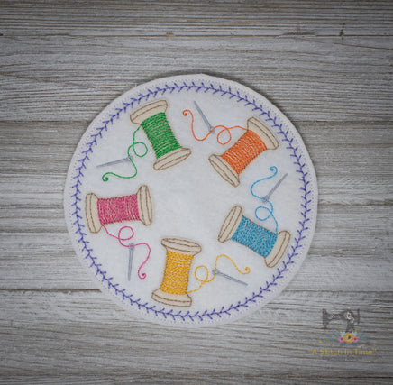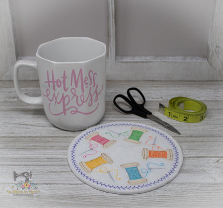 *This listing is for the ITH Thread Spools Mug Rug design file only. Any other designs or supplies shown in photos here are samples of completed projects using additional designs and supplies.