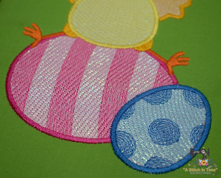 This cute design is digitized with a light fill stitching that “shows through” and stitched onto an iridescent mylar underneath. This creates a sparkly jewel toned effect that is so pretty.