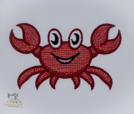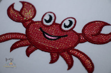This cute crab design is digitized with a light fill that "shows through" and stitched out on fabric with opalescent mylar created for embroidery designs layered on top of the fabric. This creates a sparkly jewel toned effect that is so pretty!