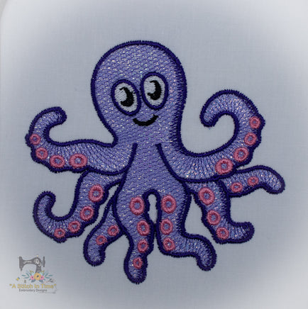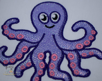 This cute octopus design is digitized with a light fill that "shows through" and stitched out on fabric with opalescent mylar created for embroidery designs layered on top of the fabric. This creates a sparkly jewel toned effect that is so pretty!