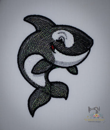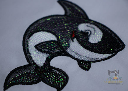 This cute orca design is digitized with a light fill that "shows through" and stitched out on fabric with opalescent mylar created for embroidery designs layered on top of the fabric. This creates a sparkly jewel toned effect that is so pretty!