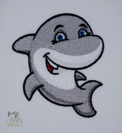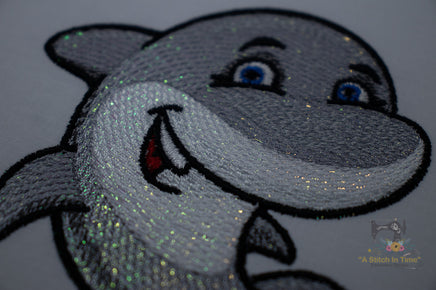 This sassy shark design is digitized with a light fill that "shows through" and stitched out on fabric with opalescent mylar created for embroidery designs layered on top of the fabric. This creates a sparkly jewel toned effect that is so pretty!