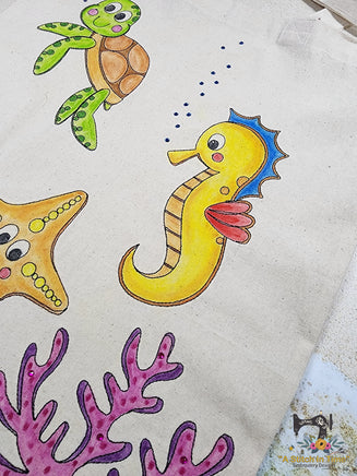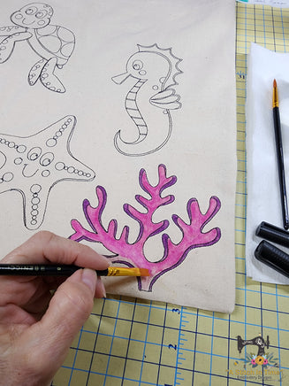Instructions for placing, stitching and coloring on tote bag included with set.