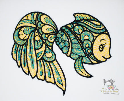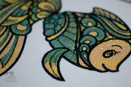 This fun fish design is digitized with a light fill that "shows through" and stitched out on fabric with opalescent mylar created for embroidery designs layered on top of the fabric. This creates a sparkly jewel toned effect that is so pretty!