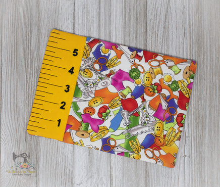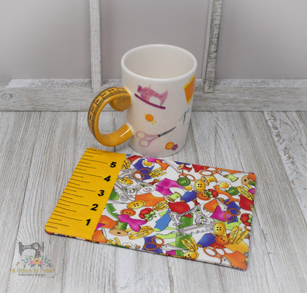 We used a cute sewing themed fabric for right side of this cute ITH mug rug.