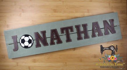 The photo with the name shown on a wooden sign was created with a 25" wide by 6" tall wooden sign, the ITH Soccer Ball design and the ITH Lettering Set