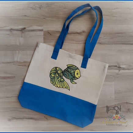 This fun fish design is digitized with a light fill that "shows through" and stitched out on fabric with opalescent mylar created for embroidery designs layered on top of the fabric. This creates a sparkly jewel toned effect that is so pretty!