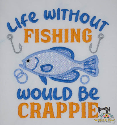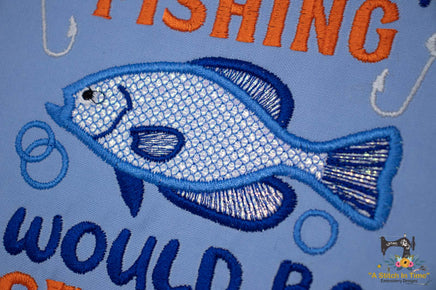 This witty fishing design is digitized with a light fill stitching that “shows through” and stitched onto an iridescent mylar underneath. This creates a sparkly jewel toned effect that is so pretty.
