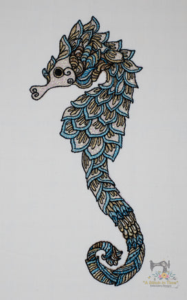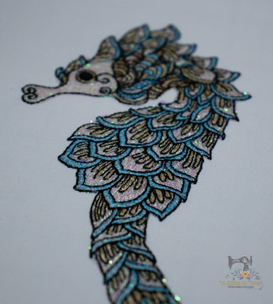 This beautiful Seahorse design is digitized with a light fill that "shows through" and stitched out on fabric with opalescent mylar created for embroidery designs layered on top of the fabric. This creates a sparkly jewel toned effect that is so pretty!
